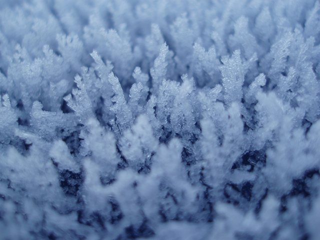 "frosty spiky growths of winter hoar frost"