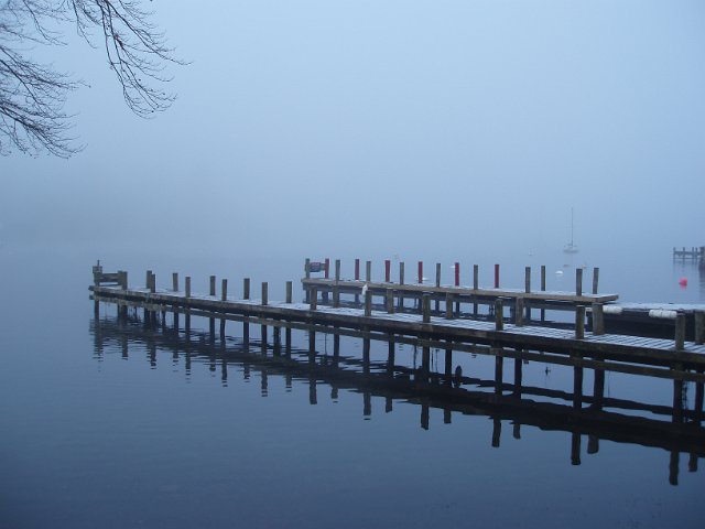 "foggy winter day over a serene lake"