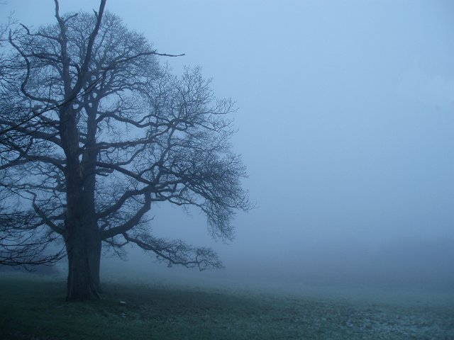 "misty, foggy winter dawn with a leafless tree silhouetted against a misty background"