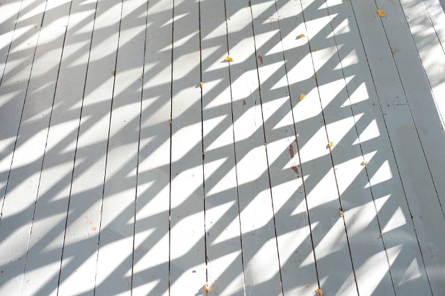 "Background texture of a painted wooden deck with diamond shadows thrown by a trellis"
