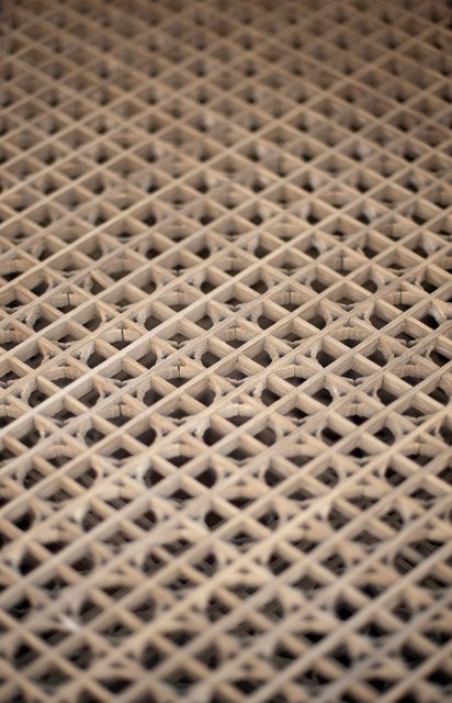 "Wooden lattice with a diamond pattern viewed from a high angle with shallow dof on a receding perspective"