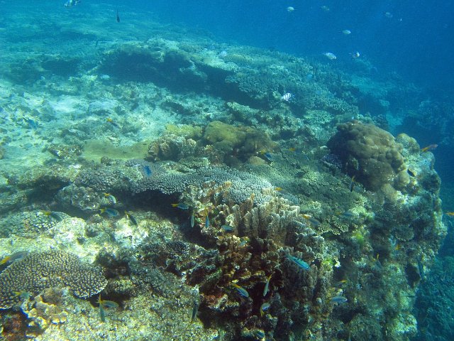 "corals and tropical reef fish from an aquamarine underwater landscape"