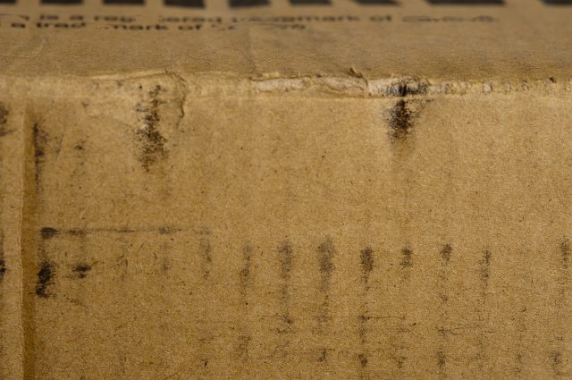 "Dirty grunge brown cardboard box background texture with damage from staples and grimy lines, full frame view"