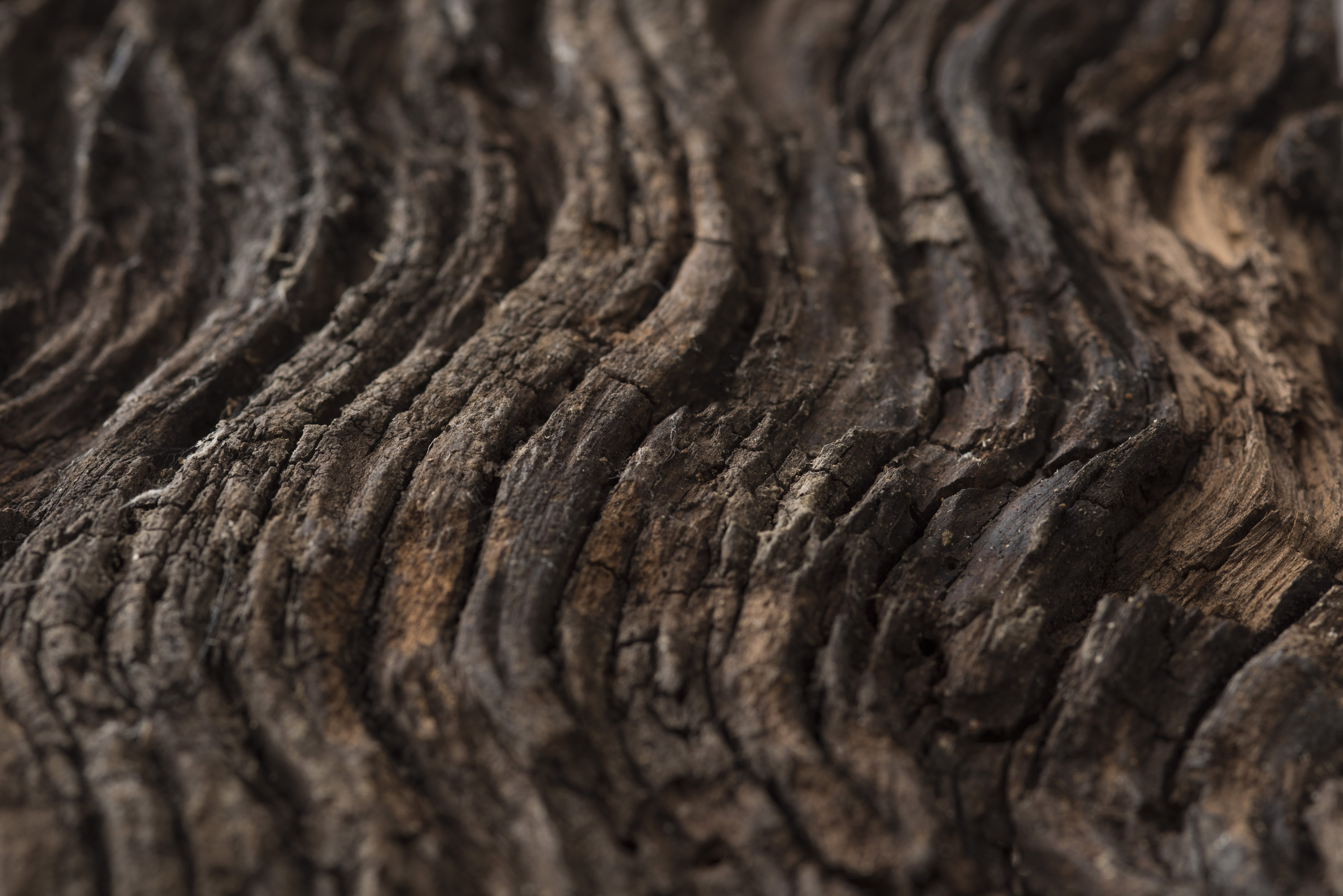 "Dark brown tree bark in selective focus on wavy wooden surface viewed in close-up and full frame. Natural background concept"