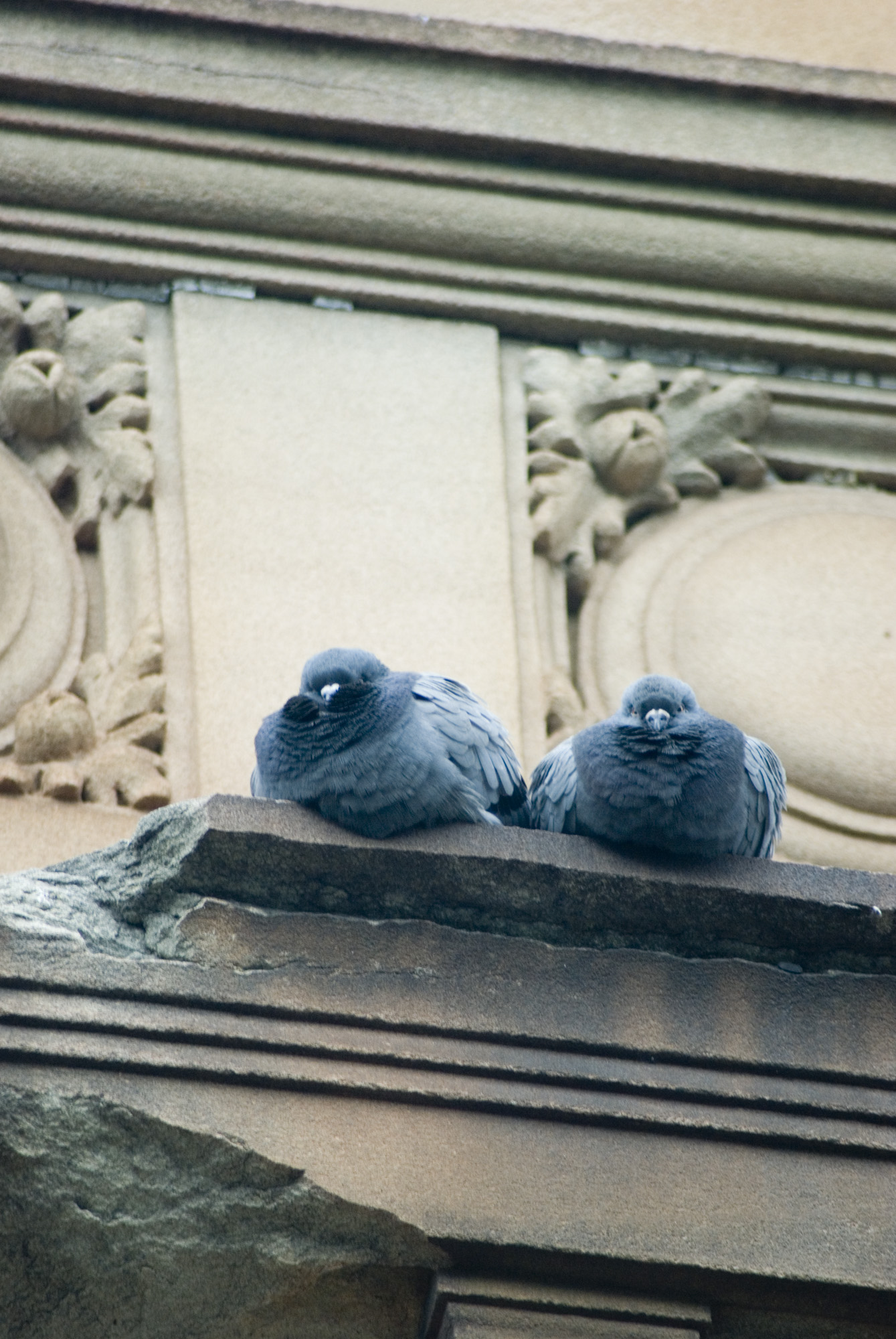 "blur: two pigeons huddled on a building ledge"