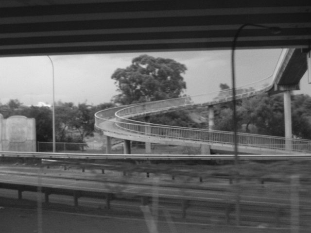 "monochrome blurred view of a concete pedestrian walkway"