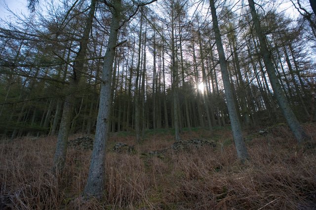 "early morning night shining through trees in a forest platation"