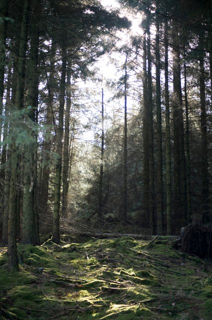 "dense forest woodland with a small moss covered clearing and light from the rear"