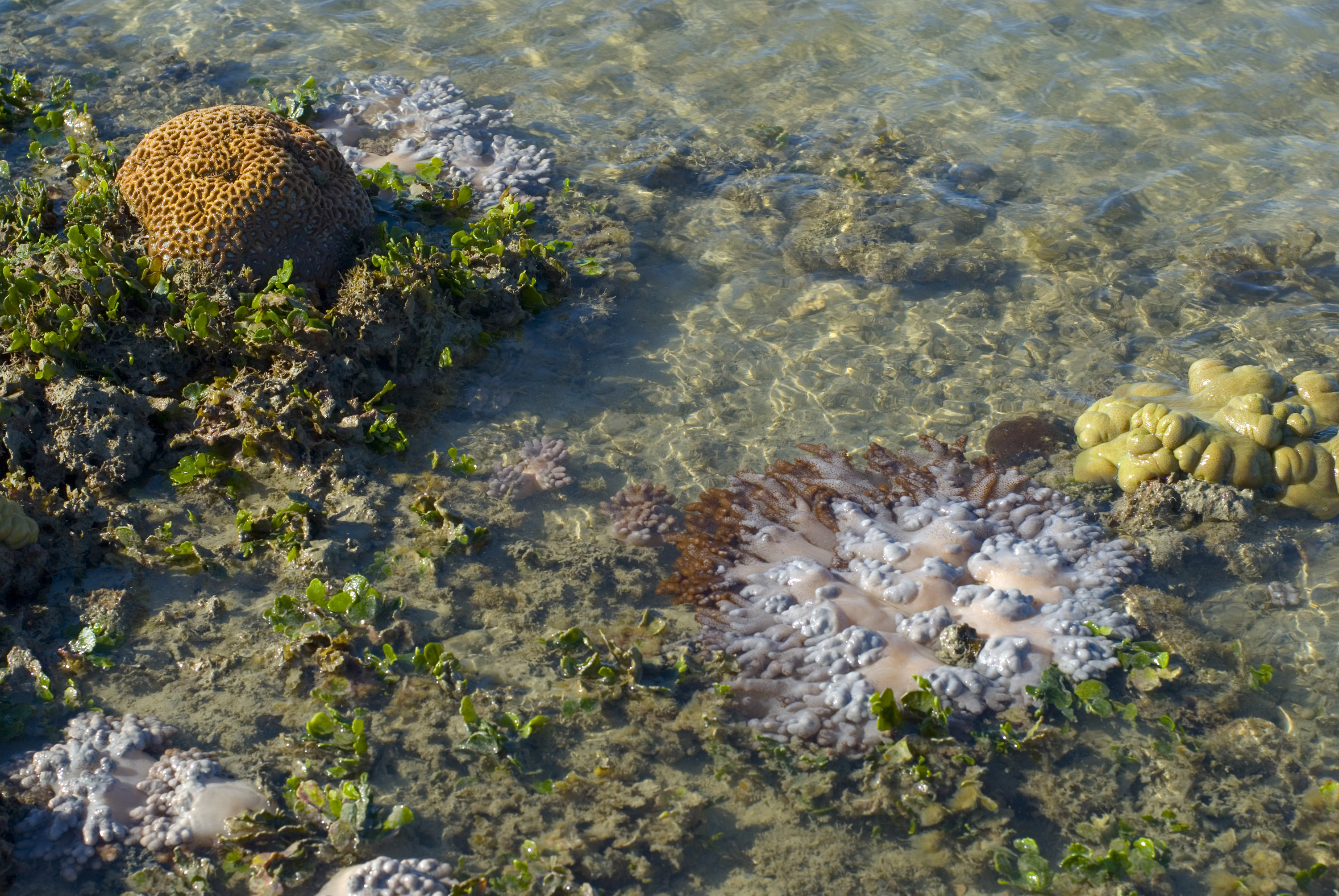 "an assortment of corals growing on a fringing reef at low tide"