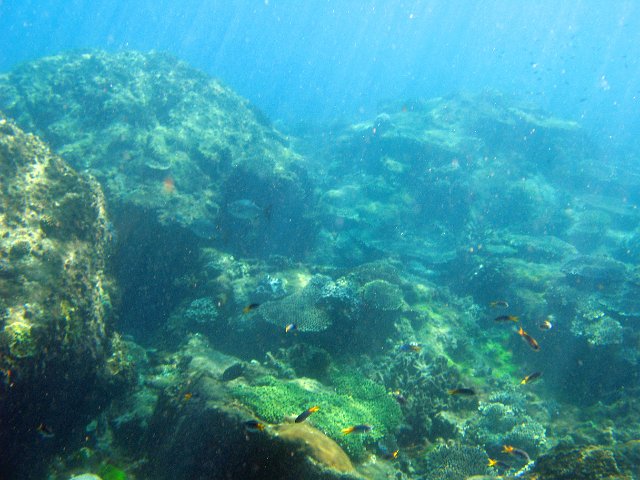 "fish swimming on the coral reef with dappled light"