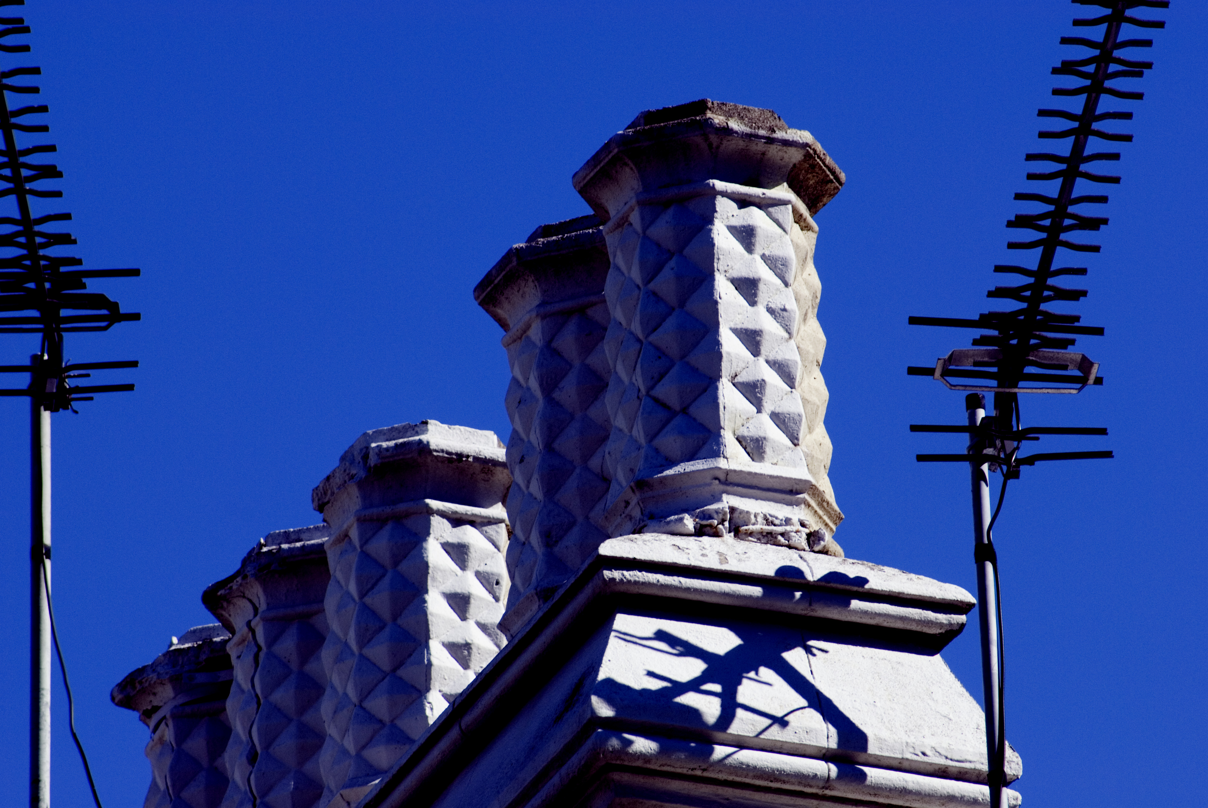"detail of a roof top against a vivid blue sky"
