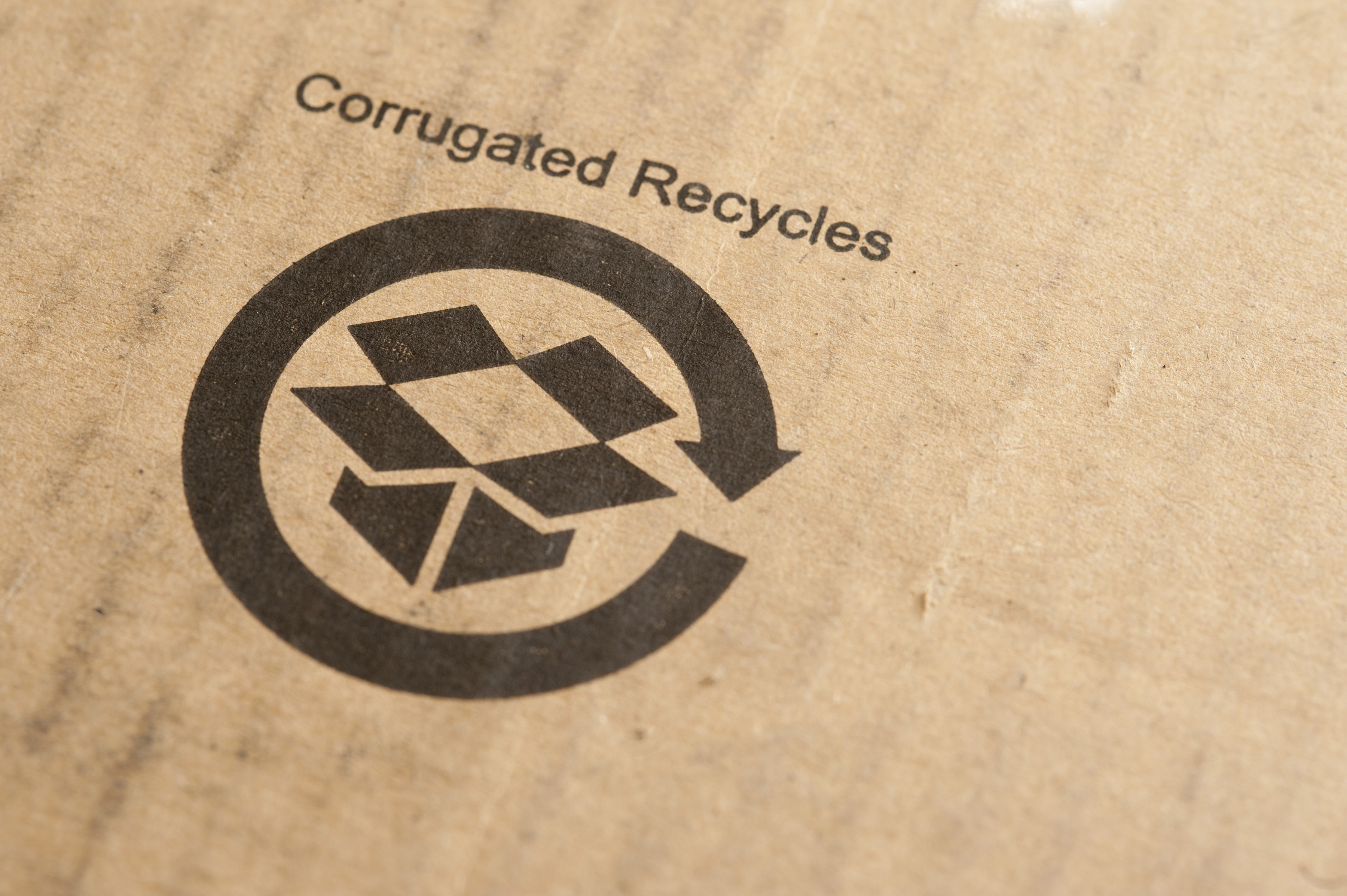 "Recycled sign stamped on a cardboard packaging box or carton with the text - Corrugated Recycles - in an environmental concept"