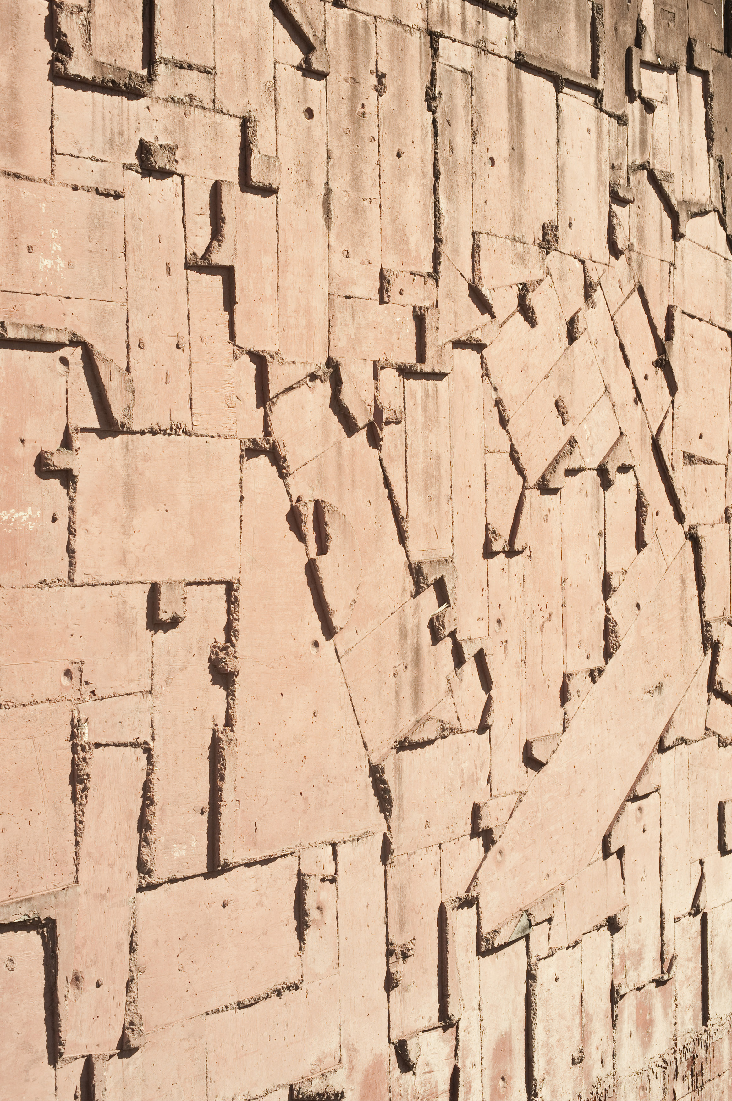 "Decorative abstract pattern on a concrete wall with random geometric shapes packed tightly together in an oblique angle view"