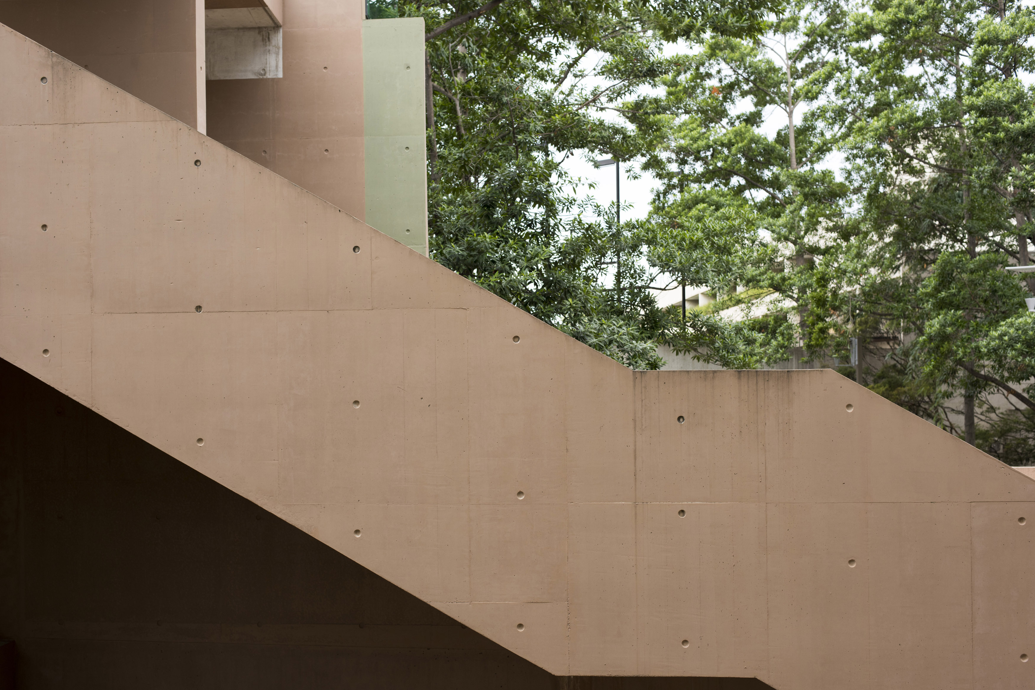 "A side on, profile shot of an outdoor concrete stairwell."