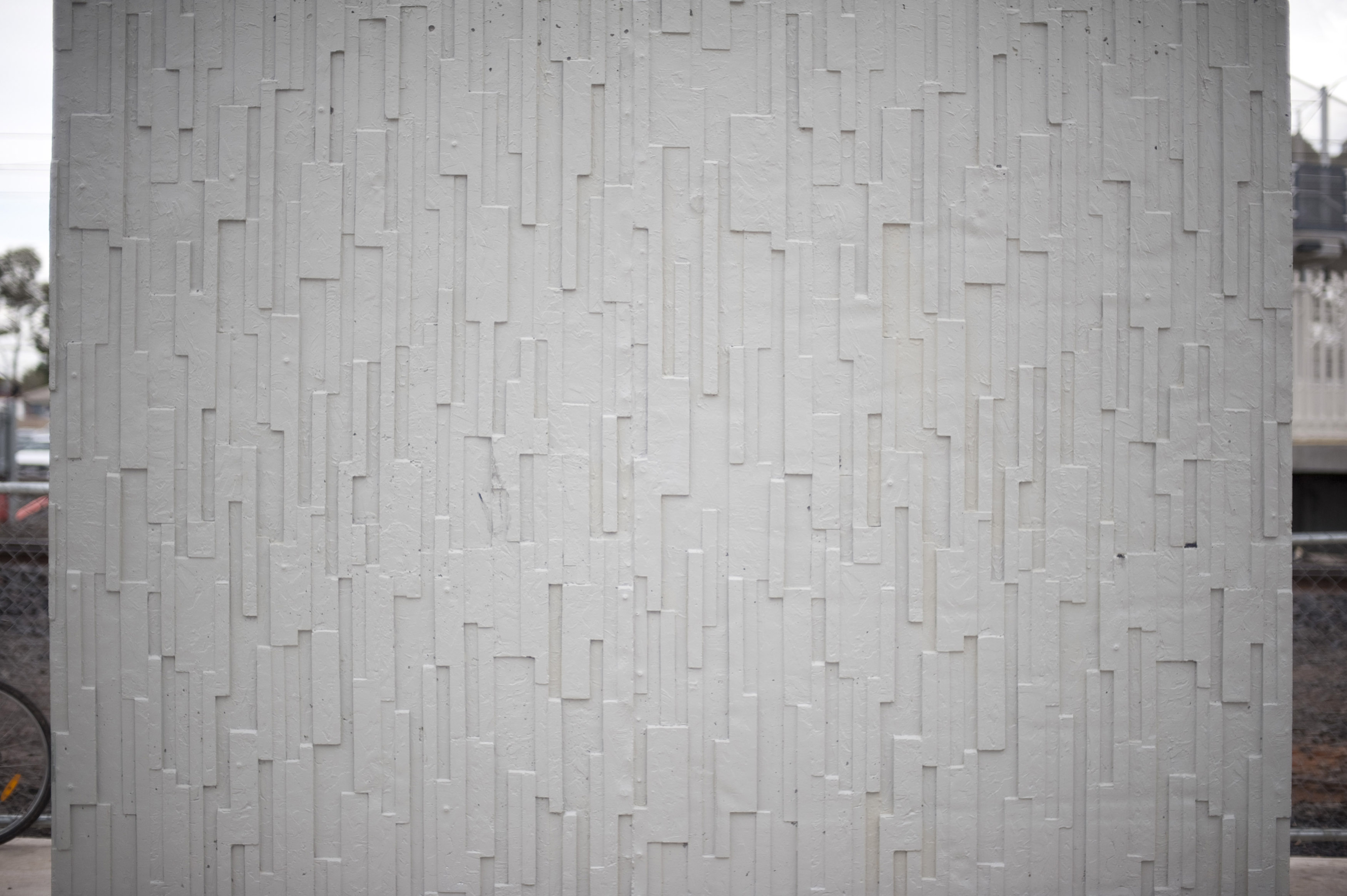 "Exterior decorative textured concrete wall in a street with geometric rectangular pattern in relief"
