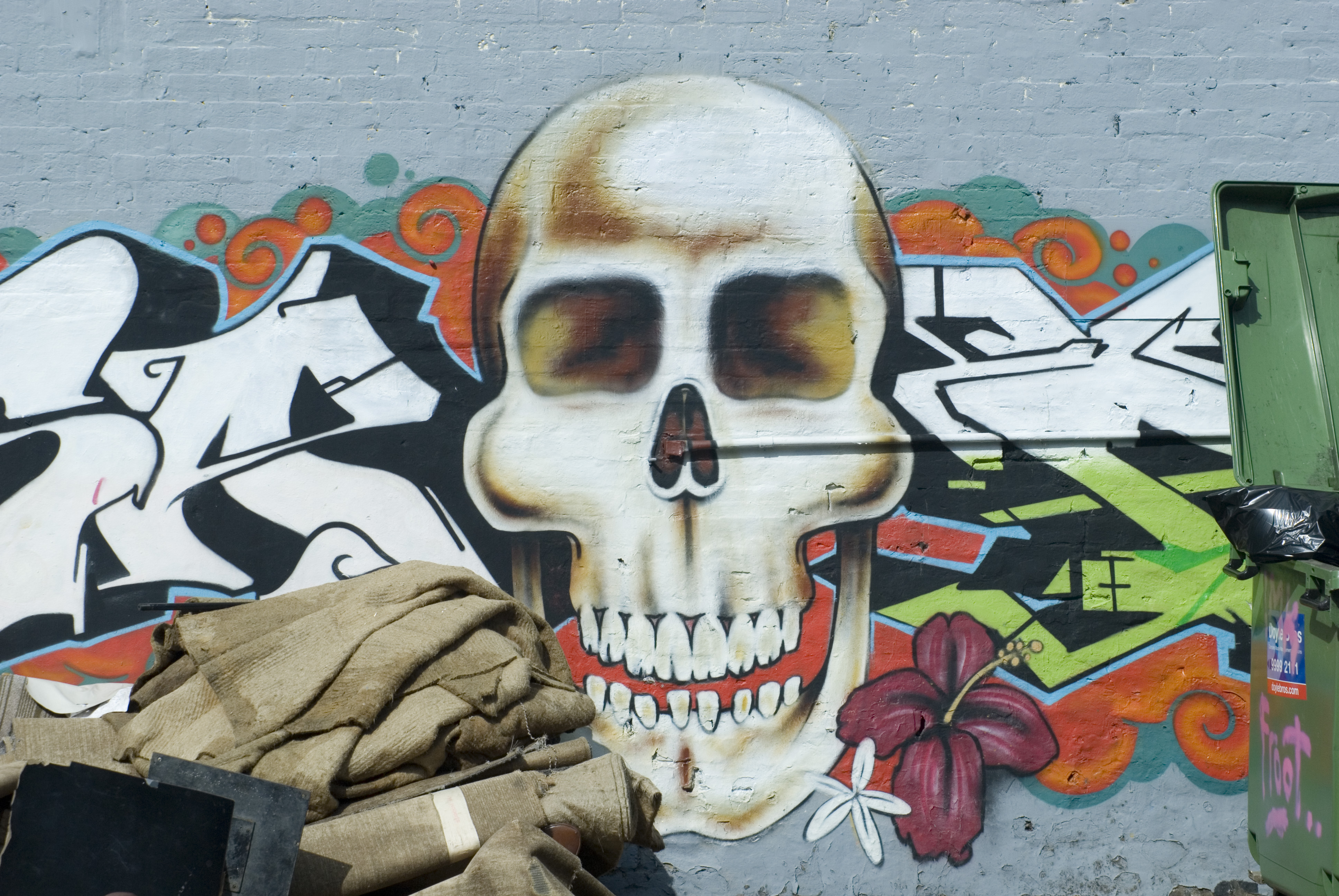 "a wall covered in graffiti with a skull motif"