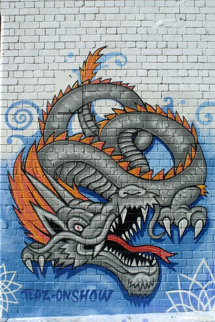 "graffiti dragon on a brick wall"