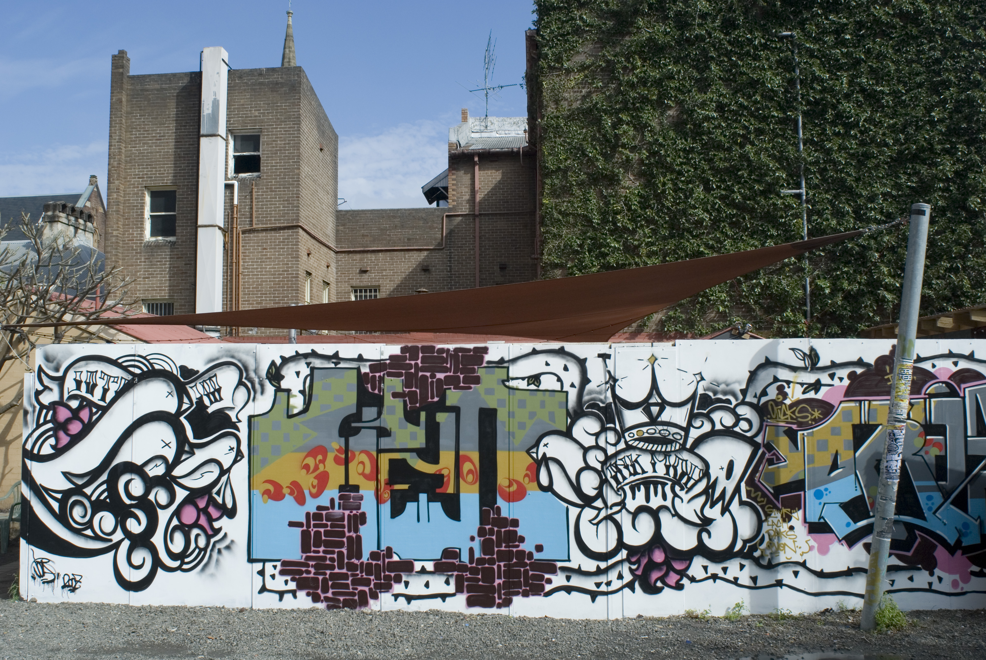 "a wall covered in graffiti"