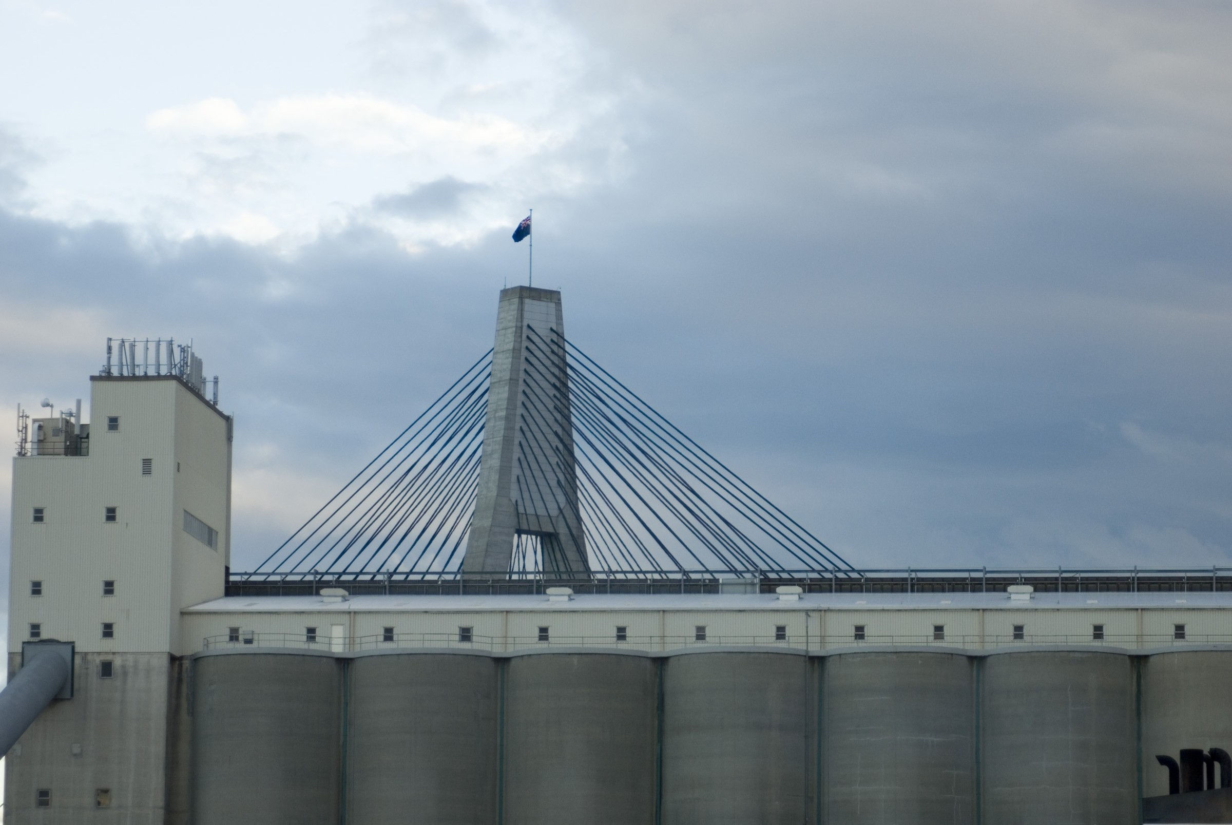 "grain silos balmain with the anzac bridge behind"