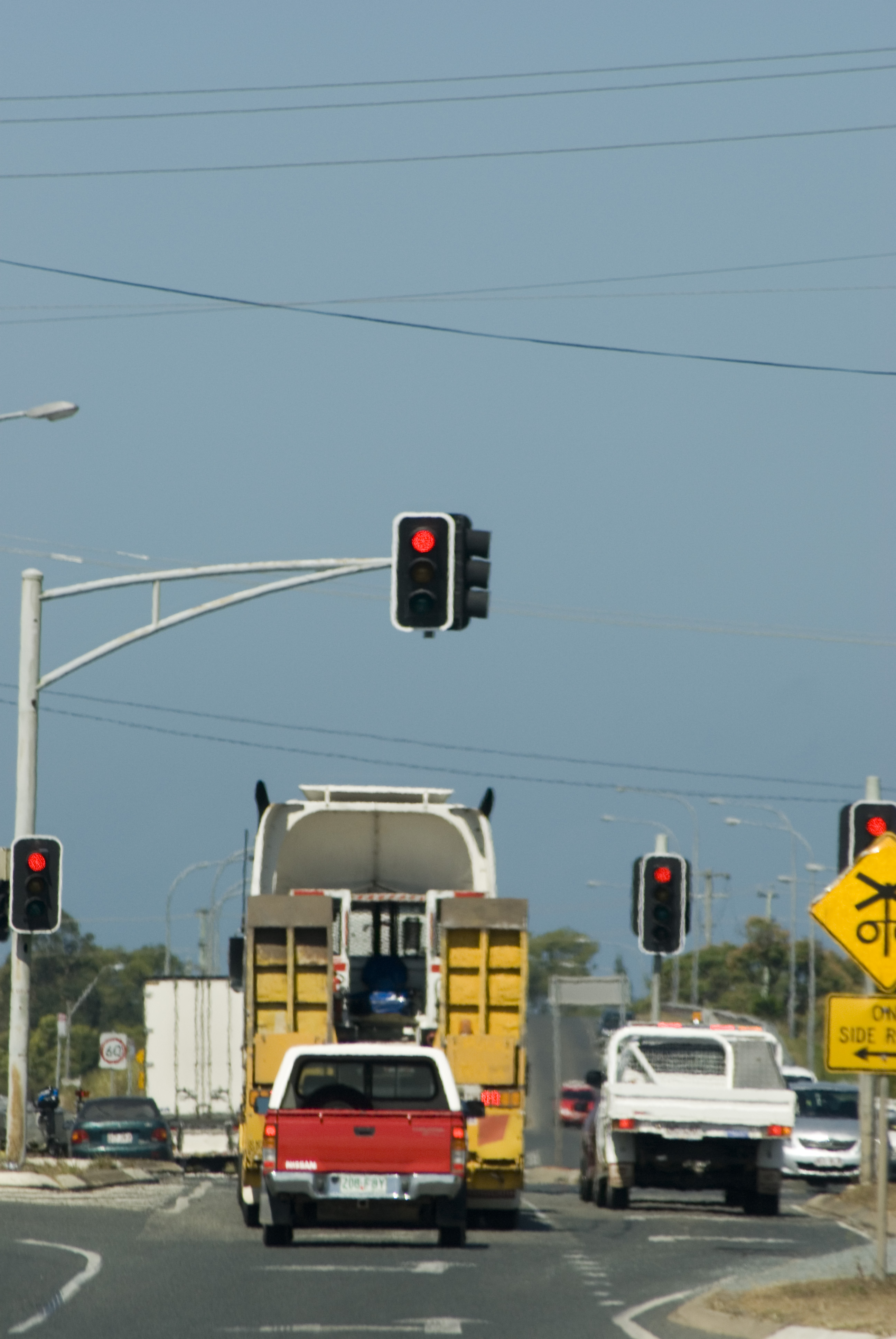 "red traffic light at an intersection, traffic waiting"
