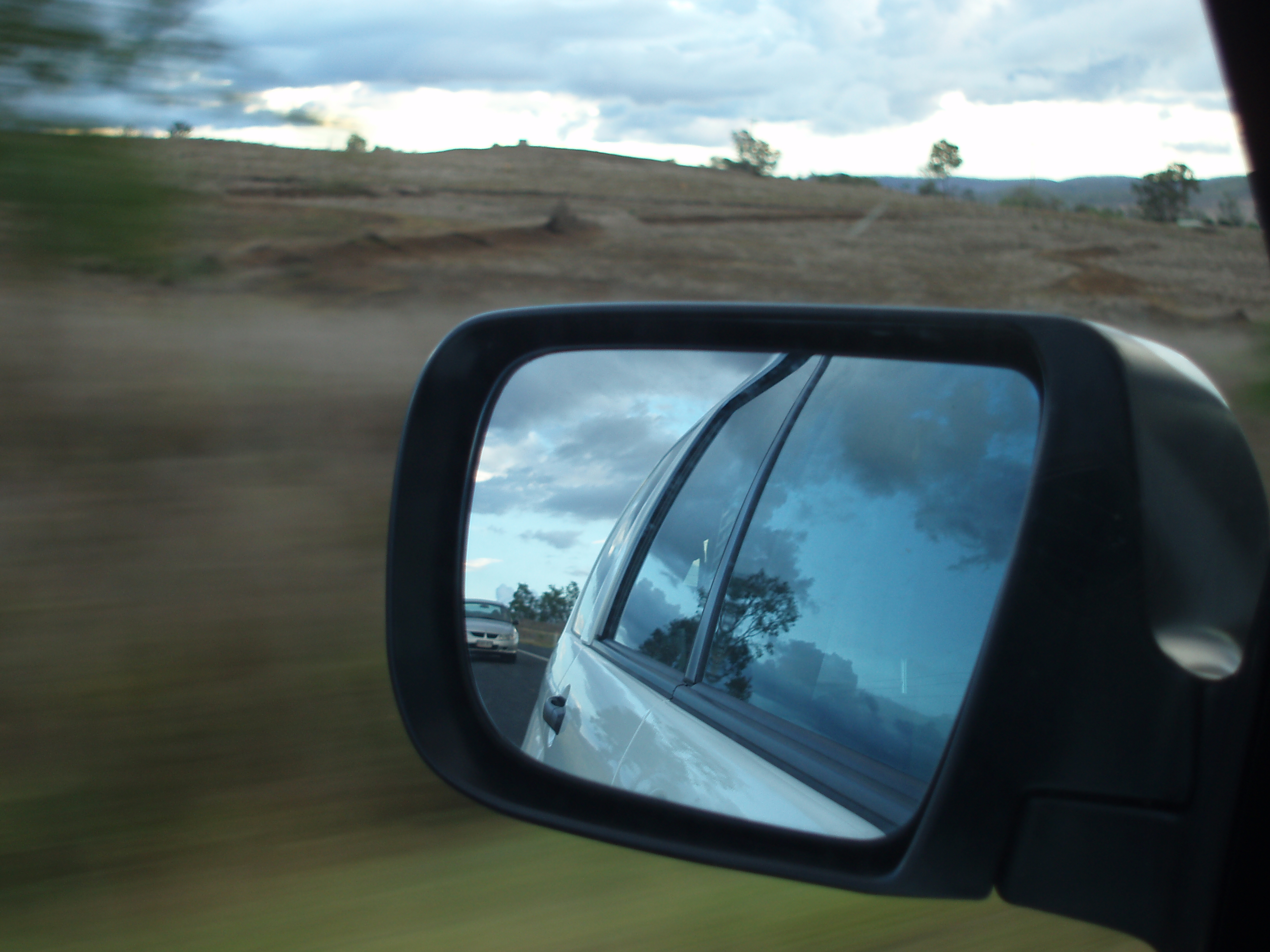 "car mirror and the car behind"
