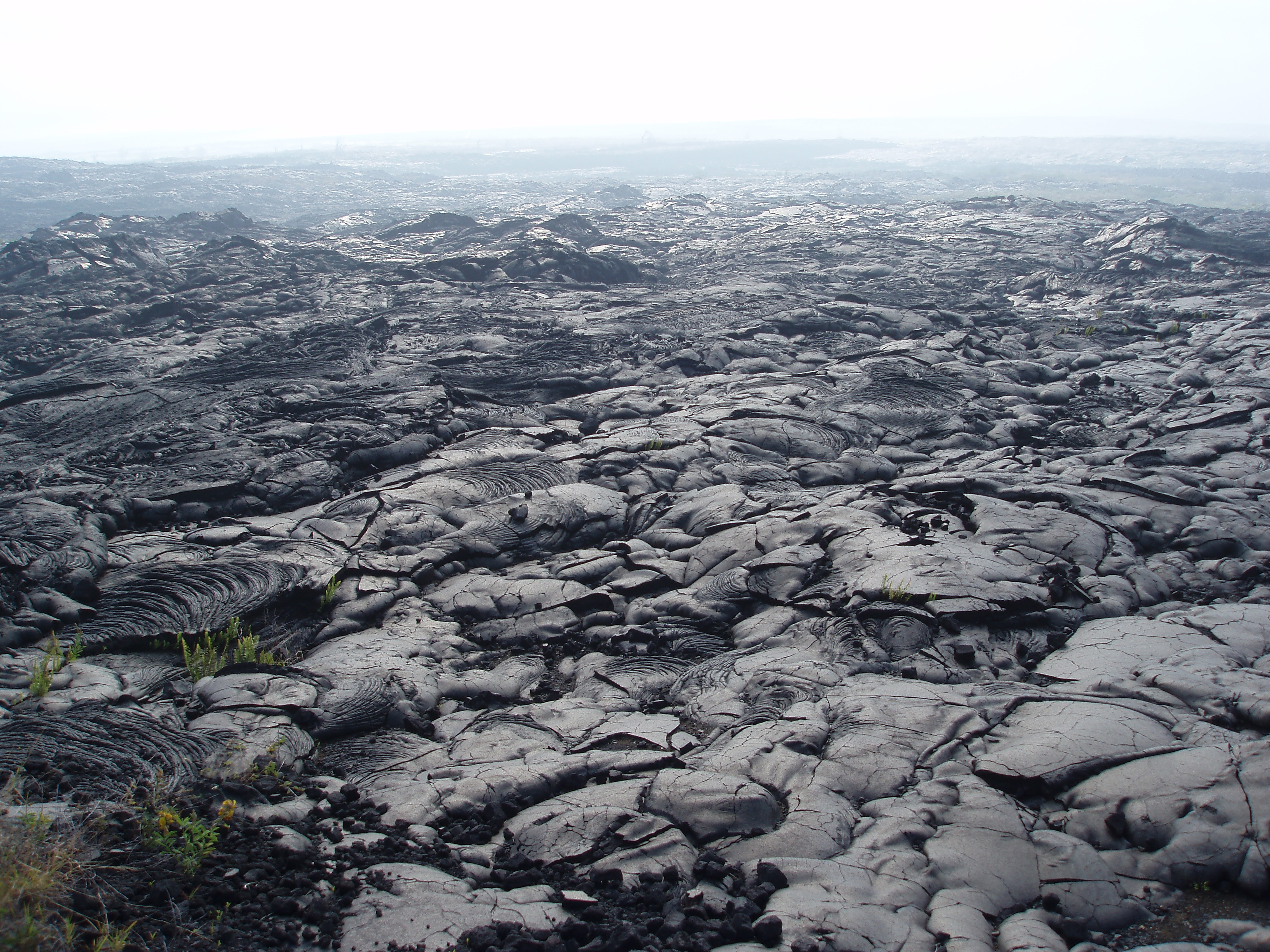 "broken surface of a solidified lava field with volcanic gasses in the background"