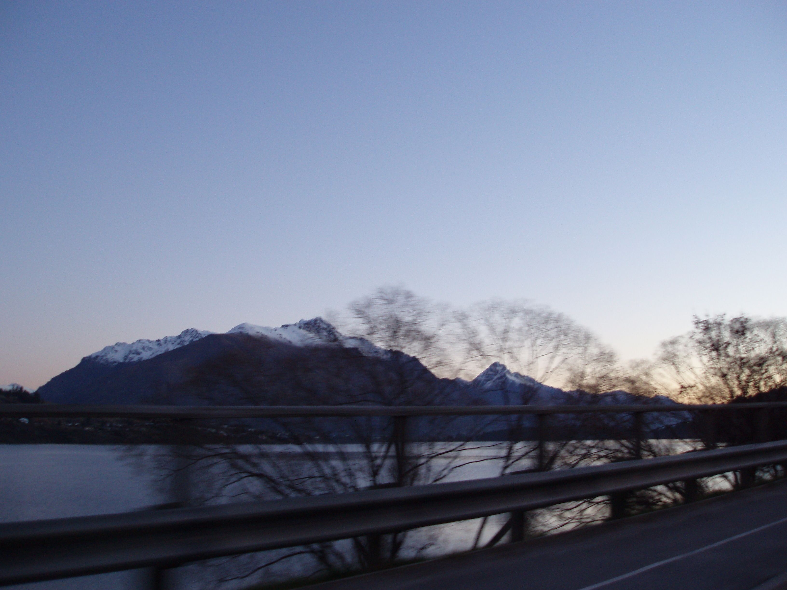 "remarkables at dusk seen from moving car"
