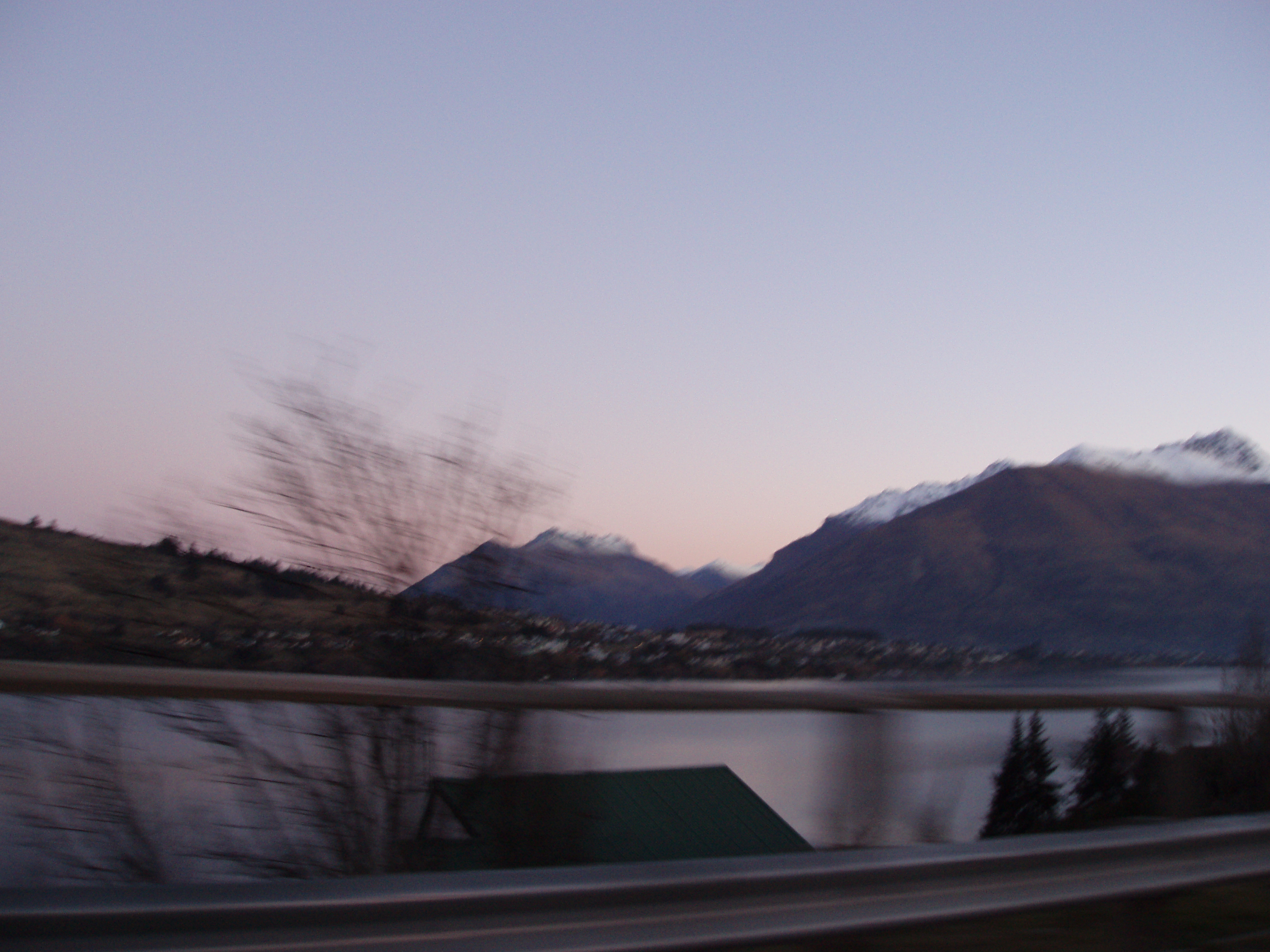"trees passing by - a view of the lake towards the remarkables at dusk"