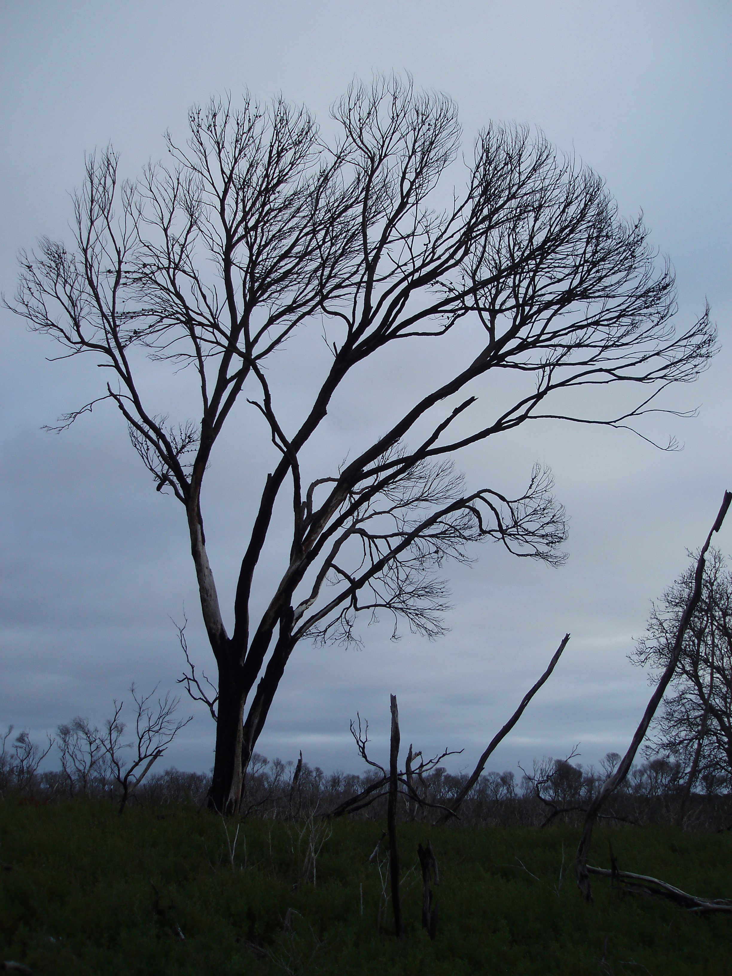 "tree branches on a stormy grey sky day"