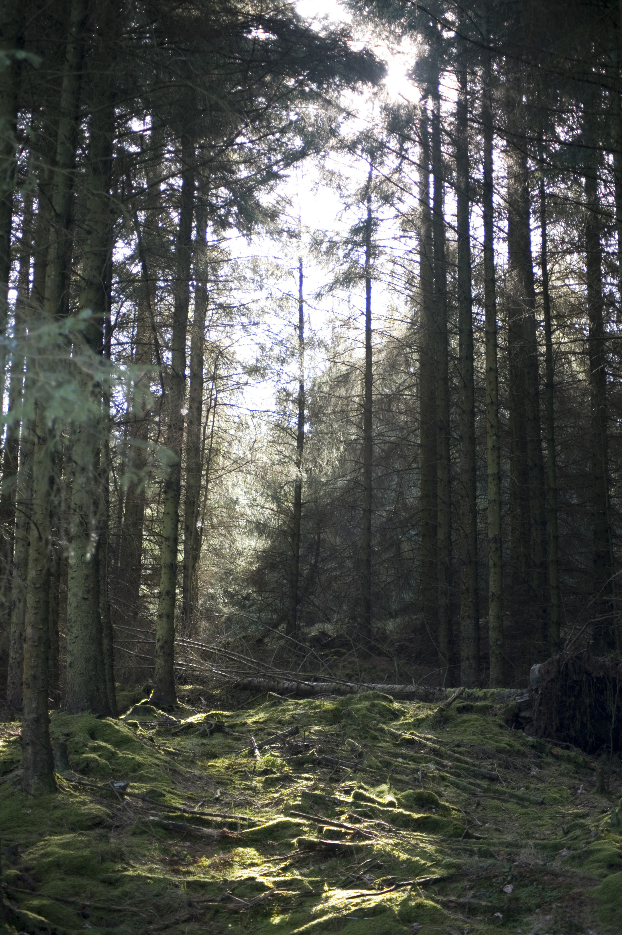 "dense forest woodland with a small moss covered clearing and light from the rear"