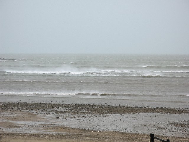 "grey oceanscape with a strong wind blowing spray of waves"