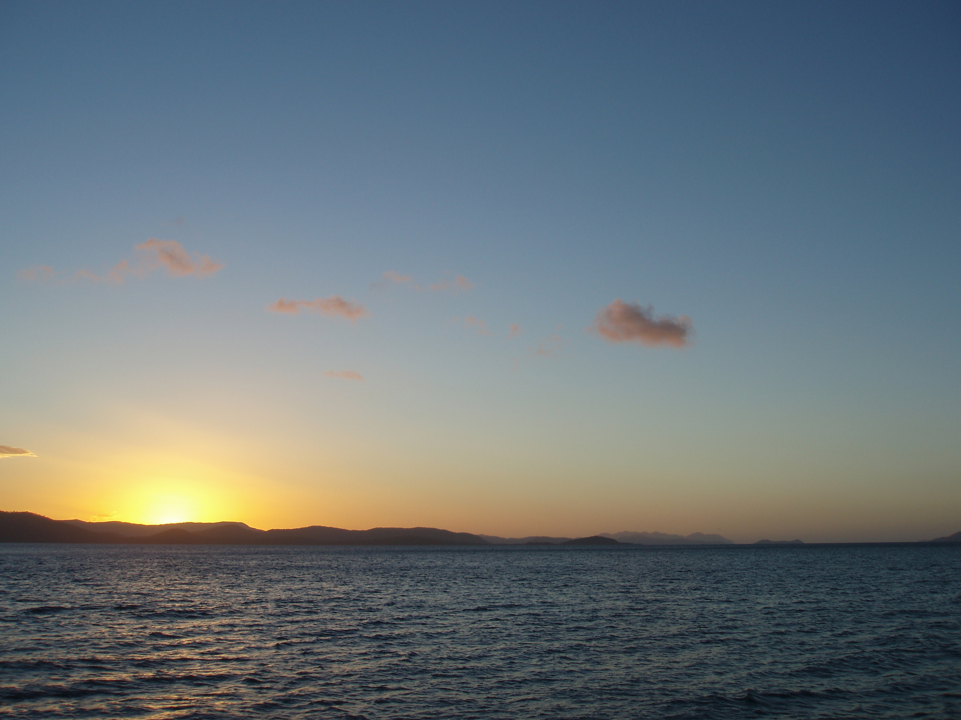 "sunset sky over a distant landscape across the water"