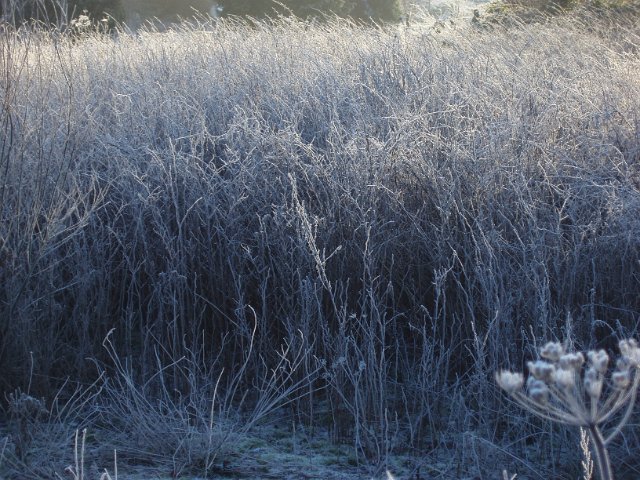 "frozen winter scene a field of tall grass frozen solid"