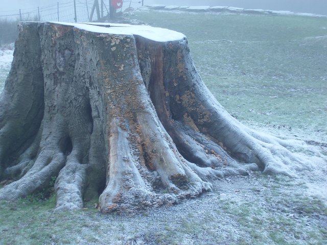 "large tree stump on a foggy and frosty morning"