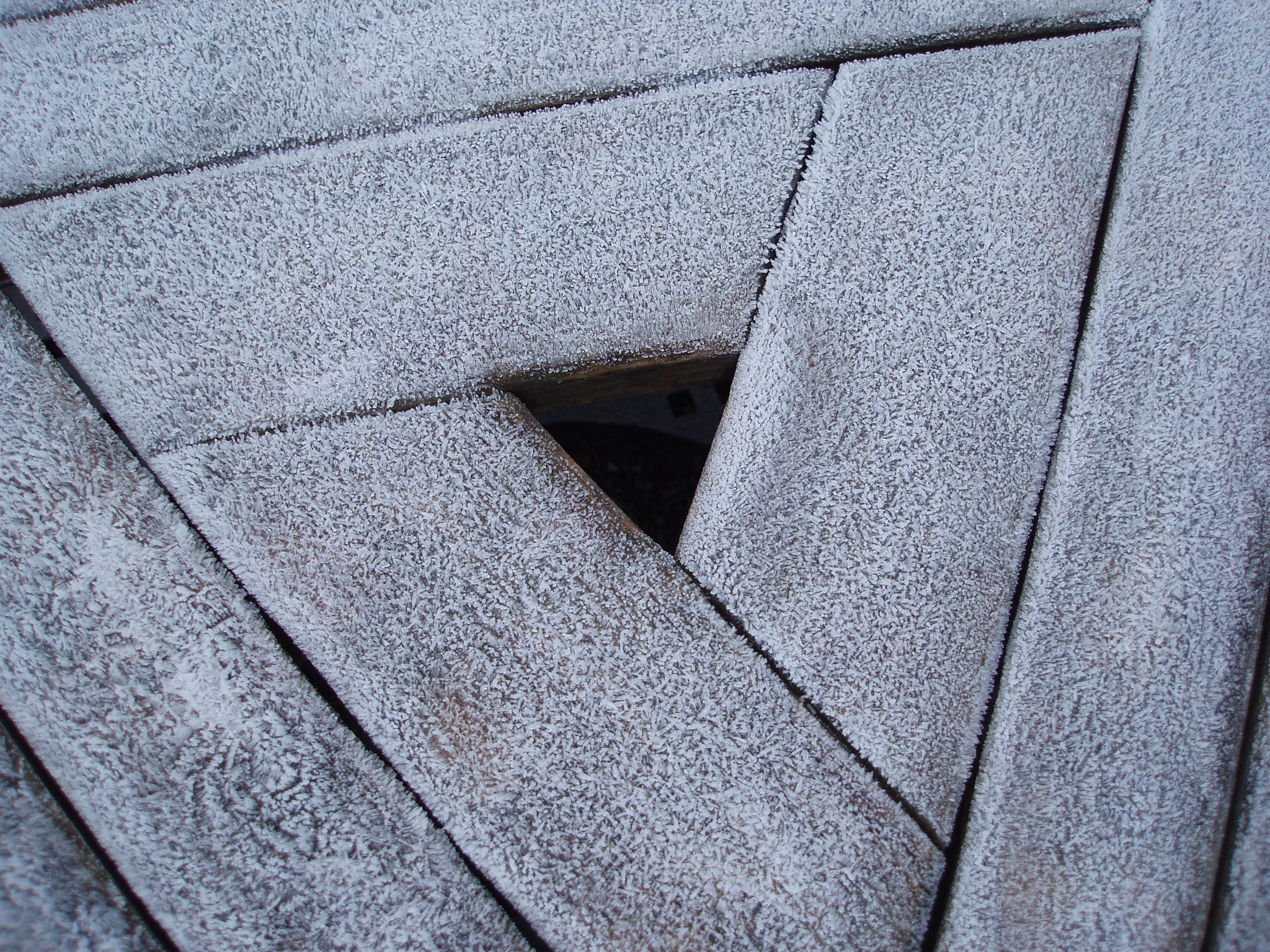 "frost on a wooden triangle decking shape"